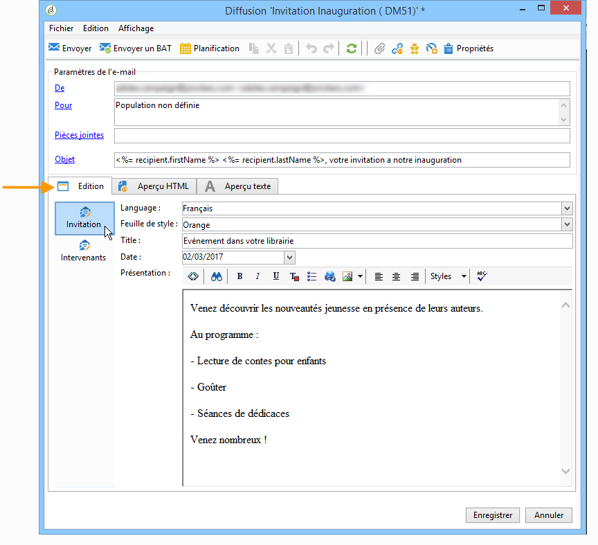 La mise en forme sera appliquée automatiquement, selon les paramètres sélectionnés. Pour la visualiser, cliquez sur l'onglet Aperçu HTML (ou Aperçu texte) et sélectionnez un destinataire afin de tester les éléments de personnalisation.