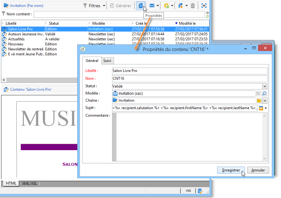Une fois créé, le contenu est ajouté dans la liste des contenus disponibles. Cliquez sur le lien Propriétés pour en modifier le libellé, le statut ou consulter son historique.