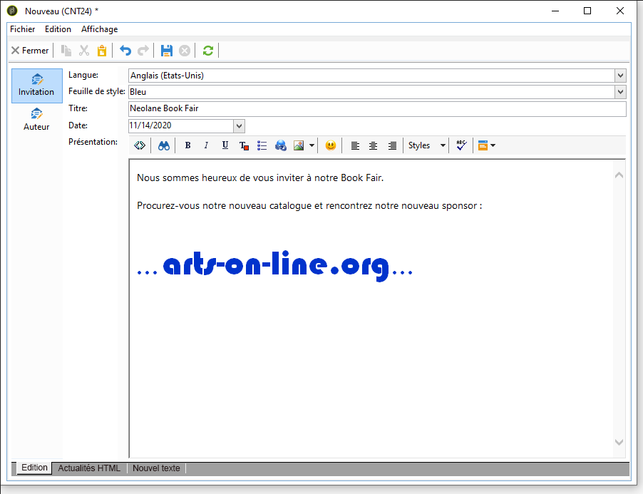 Les contenus texte et HTML sont automatiquement renseignés.