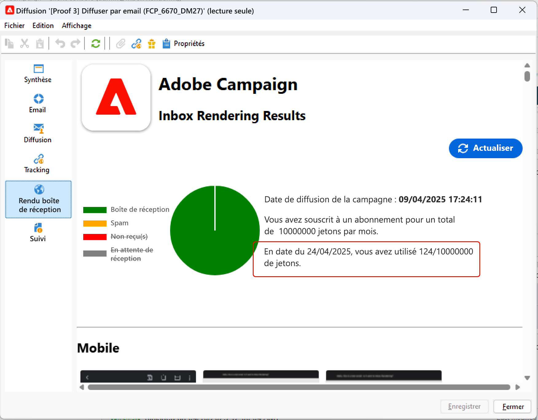 Le nombre de jetons disponibles restants est indiqué dans la synthèse générale du Rapport d'inbox rendering.