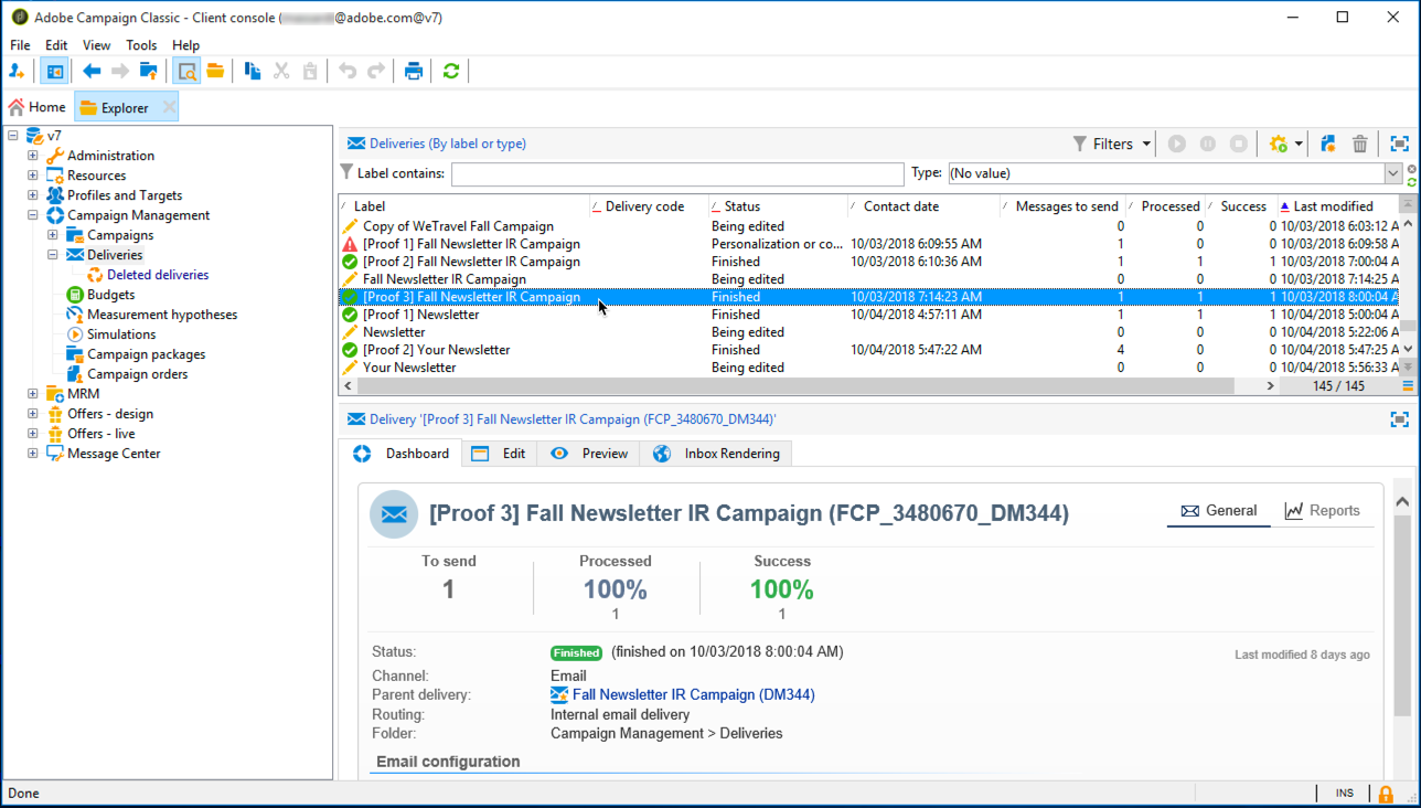 받은 편지함 렌더링 보고서가 표시됩니다.
