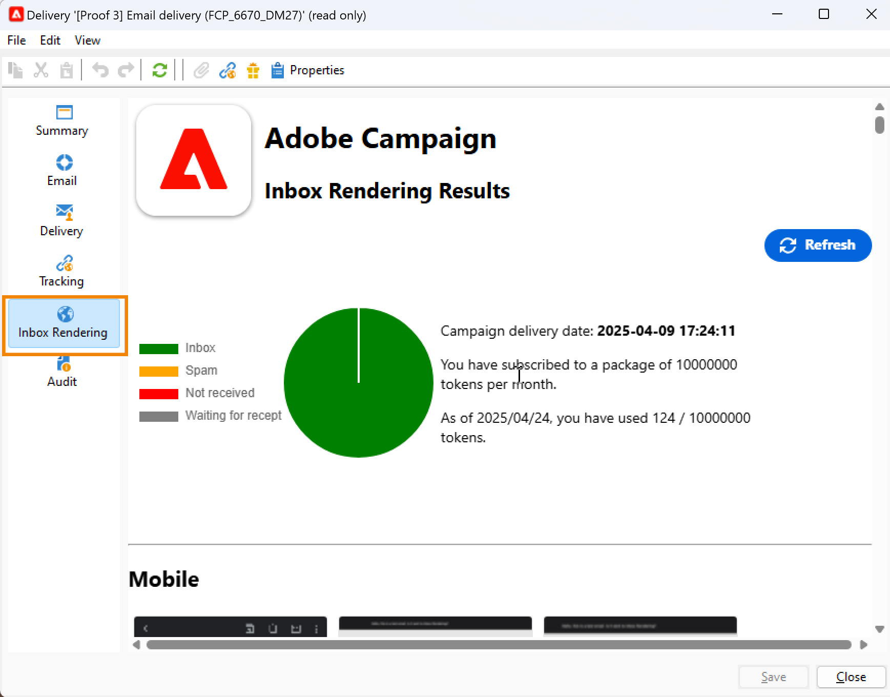 일반적으로 받은 편지함 렌더링 기능은 새로 디자인된 이메일의 HTML 프레임워크을 테스트하는 데 사용됩니다. 각 렌더링에는 약 70개의 토큰이 필요합니다(일반적으로 테스트되는 환경 수에 따라 다름). 그러나 일부 경우에는 게재를 완전히 테스트하기 위해 여러 개의 받은 편지함 렌더링 보고서가 필요할 수 있습니다. 따라서 여러 점검을 완료하는 데 더 많은 토큰이 필요할 수 있습니다.