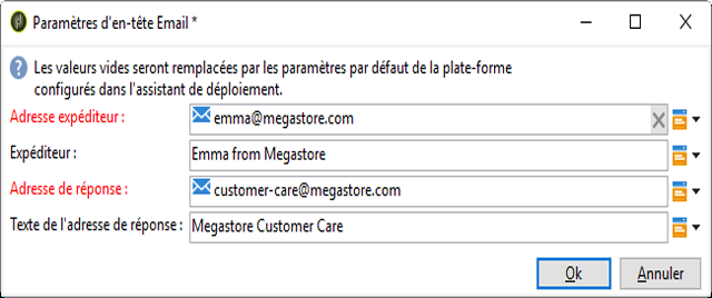 Dans le modèle de diffusion, cliquez sur le lien De. Dans la fenêtre Paramètres d'en-tête email, renseignez les champs suivants :