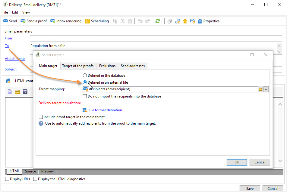 기본적으로 수신자는 데이터베이스에 가져옵니다. 을(를) 선택해야 합니다 Target mapping. 대상 매핑에 대한 자세한 내용은 대상 매핑 선택