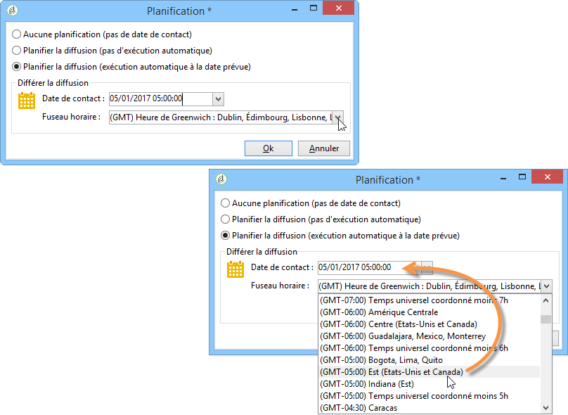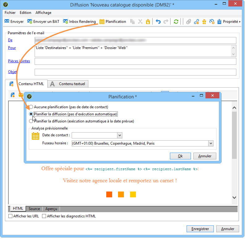 L'option Planifier la diffusion (exécution automatique à la date prévue) permet d'indiquer la date de contact.