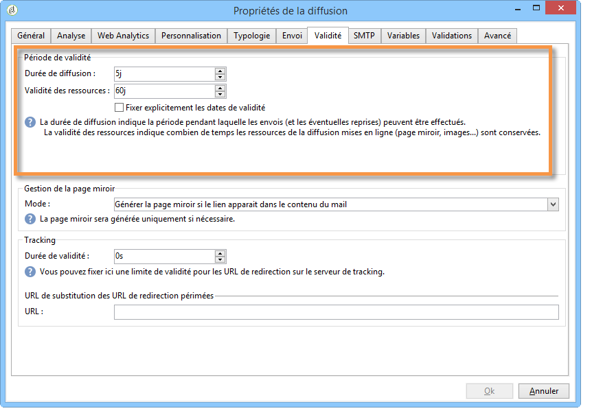 Une fois la diffusion lancée, les messages (et les éventuelles reprises) peuvent être envoyés jusqu'à la limite de la diffusion. Elle est indiquée dans les propriétés de la diffusion, à partir de l'onglet Validité.