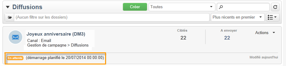 Dans la liste des diffusions, la diffusion apparaît avec le statut En attente.
