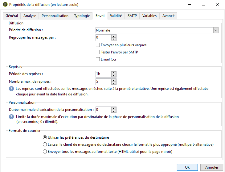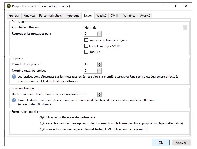 Avant d’envoyer la diffusion, vous pouvez définir les paramètres d’envoi dans les propriétés de la diffusion, via l’onglet Diffusion.