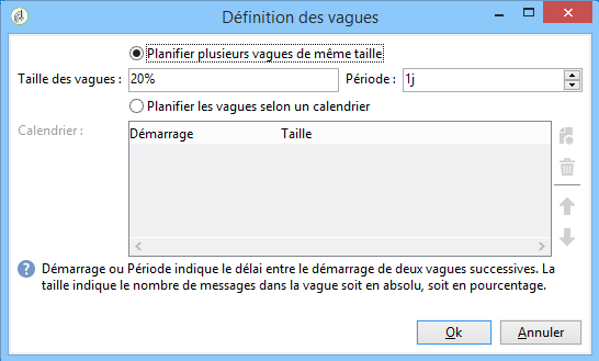 Vous pouvez uniquement définir la taille et le délai entre deux vagues consécutives. Le critère de sélection des destinataires pour chaque vague n'est pas paramétrable.