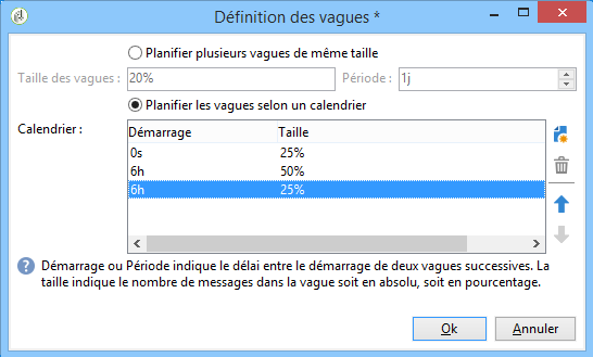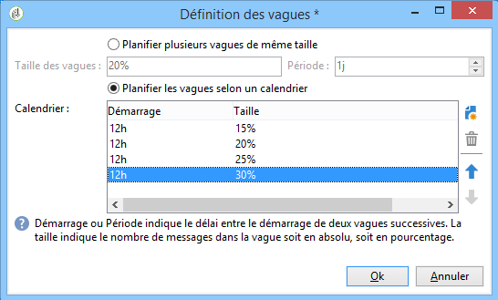 Dans la colonne Démarrage, indiquez le délai entre le démarrage de deux vagues consécutives. Dans la colonne Taille, saisissez un nombre fixe ou un pourcentage.