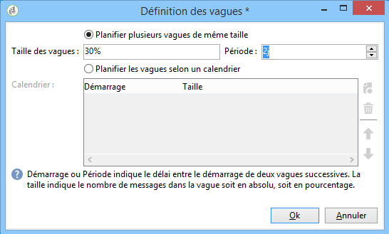Définissez la taille de chaque vague. Par exemple, si vous saisissez 30 % dans le champ correspondant, chaque vague représentera 30 % des messages inclus dans l'envoi, à l'exception de la dernière vague qui représentera 10 % des messages.