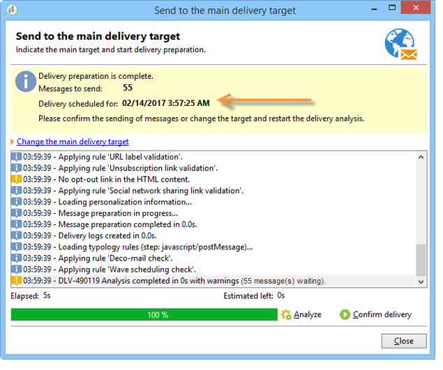 클릭 Send 을(를) 선택합니다. Postpone delivery 그런 다음 분석을 시작하고 게재를 확인합니다. 분석이 완료되면 게재 대상이 준비되고 지정된 날짜에 메시지가 자동으로 전송됩니다.