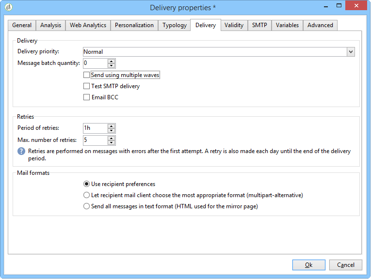 기존 Campaign MTA를 사용하는 온-프레미스 설치 및 호스팅/하이브리드 설치의 경우, Delivery 게재 매개 변수의 탭은 게재 다음 날에 수행되어야 하는 다시 시도 횟수와 다시 시도 사이의 최소 지연을 나타냅니다.