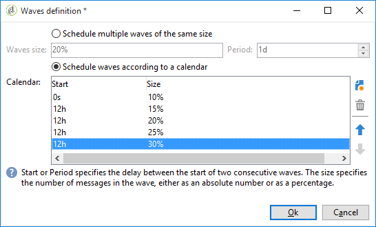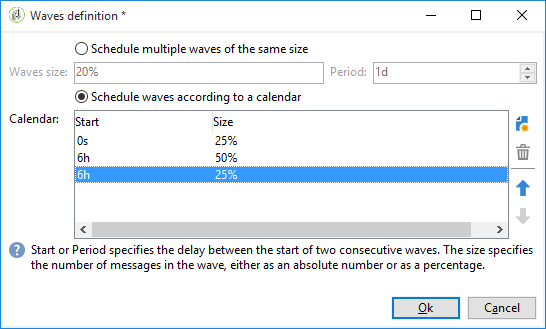 에서 Period 필드, 두 개의 연속된 웨이브의 시작 사이의 지연 시간을 지정합니다. 예를 들어, 2d 1차 파장은 즉시 시작되고, 2차 파동은 2일 후 시작되고, 3차 파동은 4일 후에 시작됩니다.