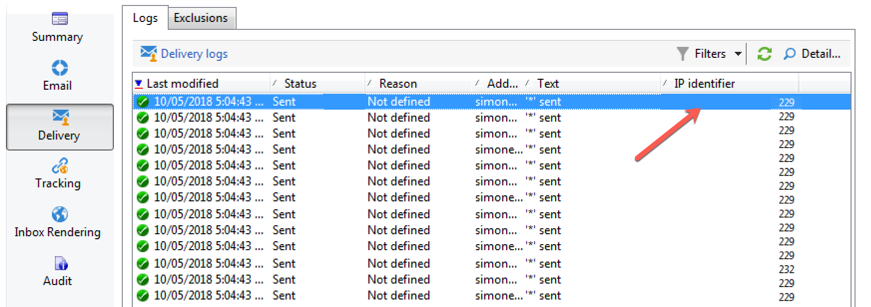게재 로그를 표시하는 목록은 Campaign Classic의 모든 목록으로 사용자 지정할 수 있습니다. 예를 들어 열을 추가하여 게재에서 각 이메일을 보낸 IP 주소를 알 수 있습니다. 자세한 내용은 이 섹션.