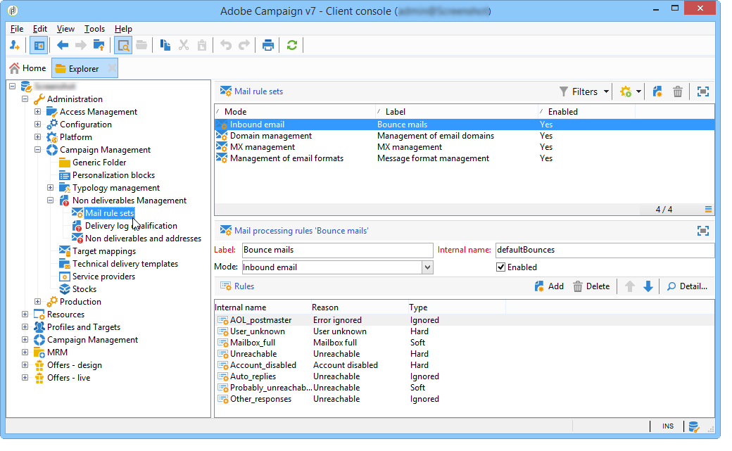 메일 규칙은 Administration > Campaign Management > Non deliverables Management > Mail rule sets 노드 아래에 있어야 합니다. 전자 메일 관리 규칙은 창 하단에 표시됩니다.