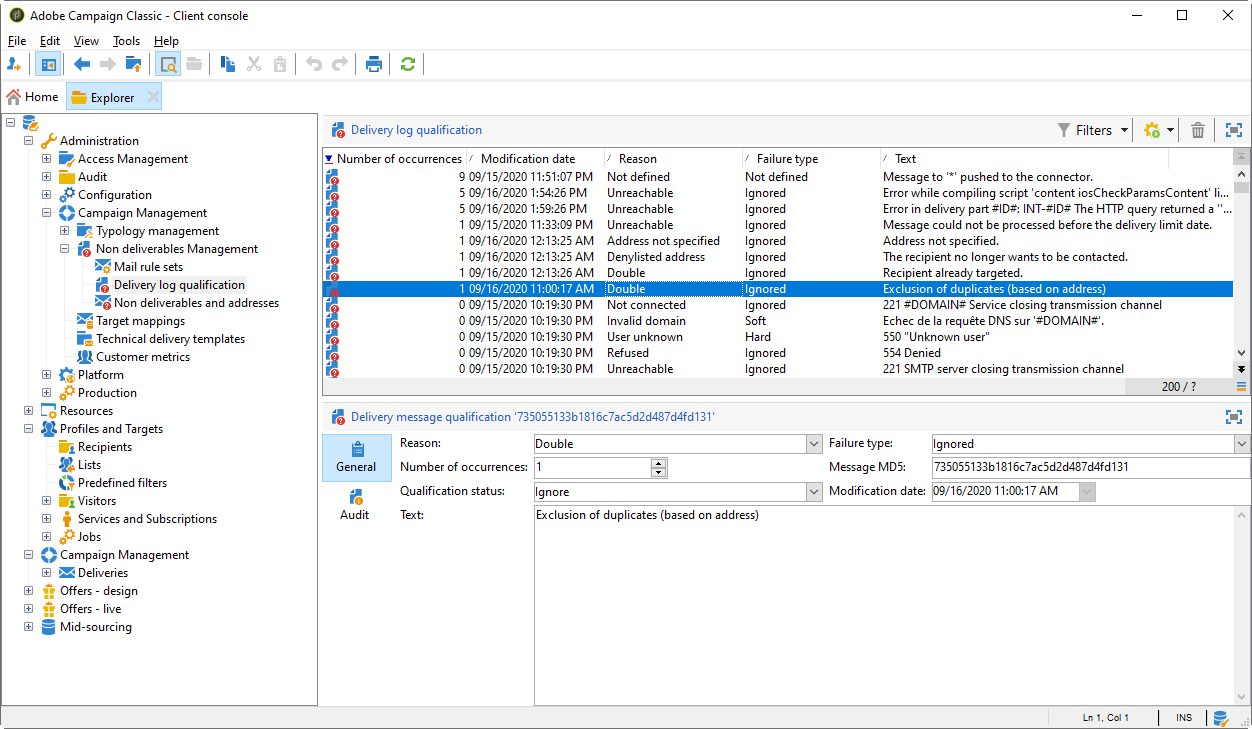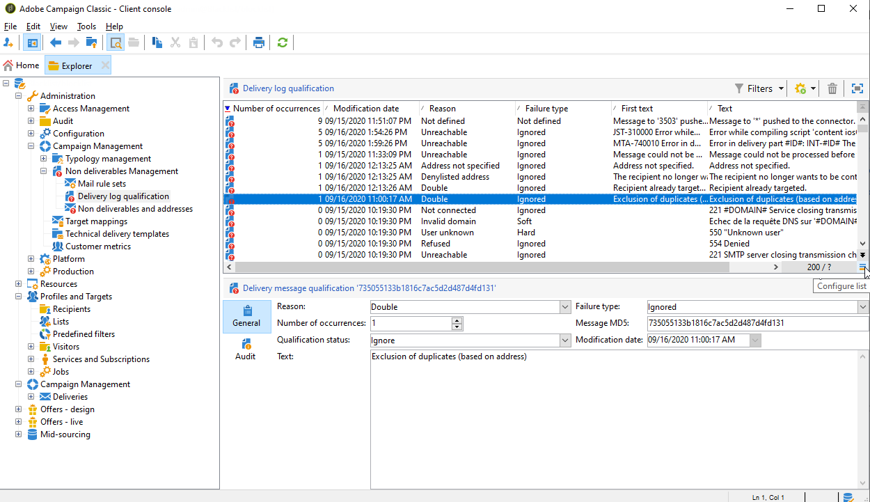이 목록은 Administration > Campaign Management > Non deliverables Management > Delivery log qualification 노드 아래에 있어야 합니다. 여기에는 게재 실패를 평가하는 데 Adobe Campaign이 사용하는 모든 규칙이 포함되어 있습니다. 이 분류는 완벽하지 않으며, Adobe Campaign에 의해 정기적으로 업데이트되며, 사용자가 관리할 수도 있습니다.
