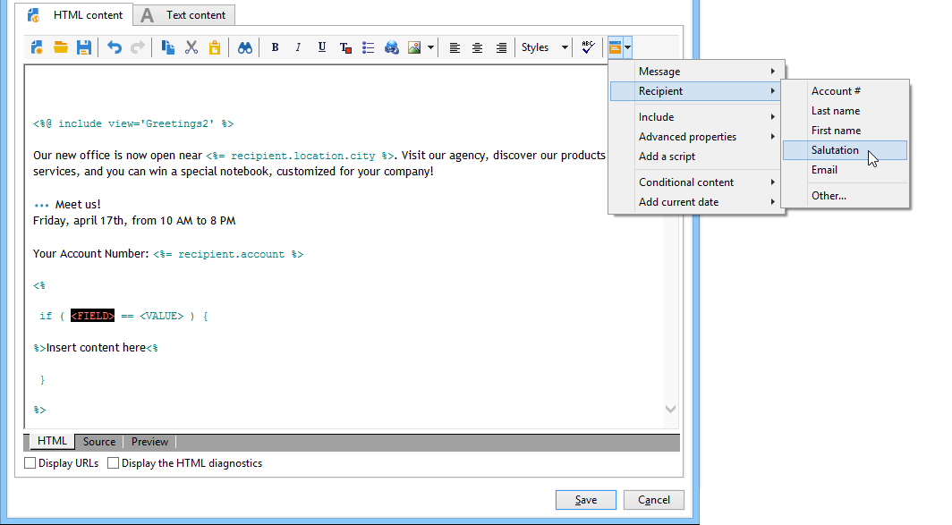전자 메일 HTML 콘텐츠에서 Source 탭하여 다음 코드를 붙여넣습니다.