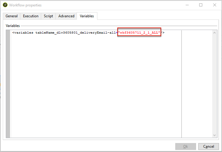 분석이 완료되면 워크플로우로 이동합니다 Properties 을(를) 선택하고 을(를) 선택합니다. Variables 탭. 여기에는 포함된 ID를 표시하기 위해 SQL 호출을 수행하는 데 사용할 수 있는 임시 테이블의 이름이 표시됩니다.