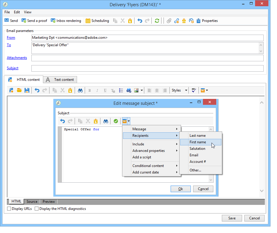 " 입력 Special offer for " 및 도구 모음의 버튼을 사용하여 개인화 필드를 삽입합니다. Recipients>Title을(를) 선택합니다.