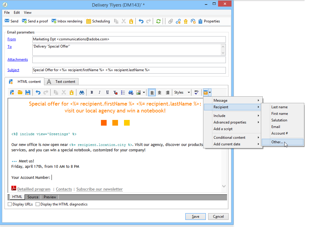 예를 들어 <%= recipient.LastName %> 구문은 Adobe Campaign에 수신자의 이름을 데이터베이스(수신자 테이블)에 삽입하도록 지시합니다.