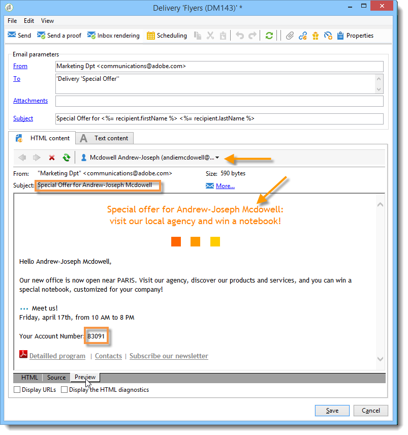 데이터 소스(수신자 필드 또는 파일 필드)를 선택한 후 이 삽입은 Adobe Campaign에서 해석하고 지정된 수신자의 필드 값으로 대체되는 명령 형식을 사용합니다. 그런 다음 물리적 교체를 Preview 탭.