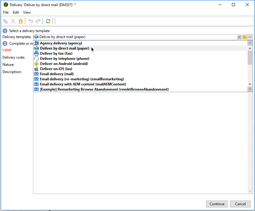 게재 템플릿을 선택합니다 DM으로 배달(용지).
