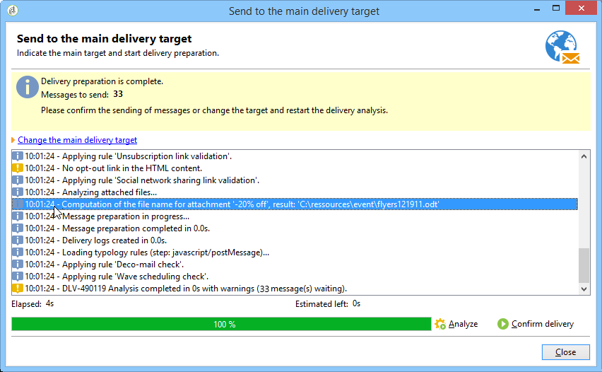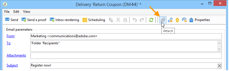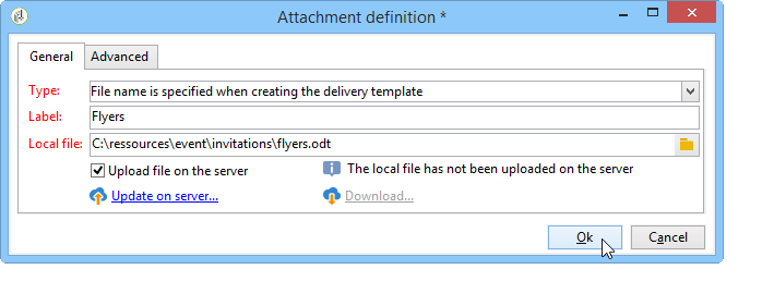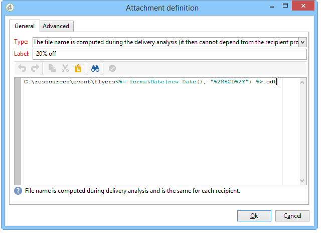 게재를 준비하는 동안 첨부 파일 이름을 계산할 수 있습니다. 이렇게 하려면 옵션을 선택합니다 The file name is calculated during delivery analysis (it cannot depend on the recipient).