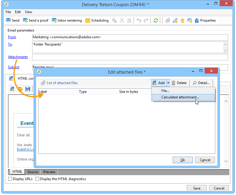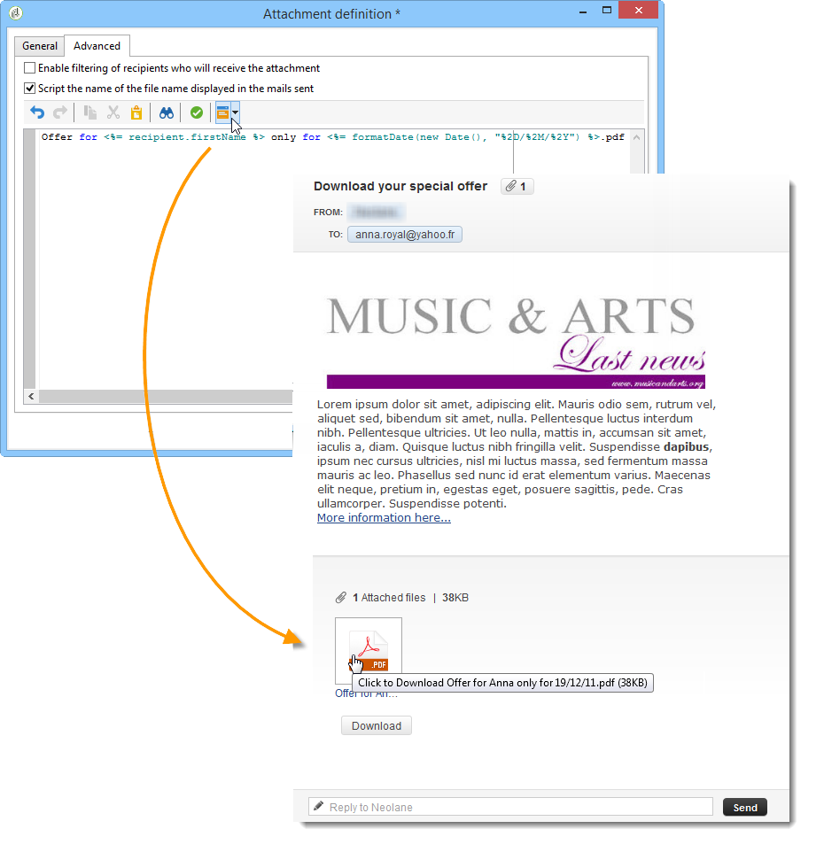계산된 첨부 파일을 만들 때 각 메시지의 분석 또는 전달 중에 첨부 파일의 이름을 계산할 수 있으며 수신자에 따라 달라질 수 있습니다. 또한 개인화되고 PDF으로 변환할 수 있습니다.