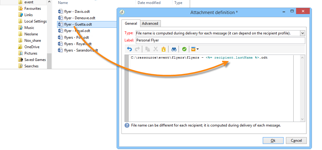 아래 예에서는 병합 필드를 사용하여 정의한 이름으로 첨부된 파일이 선택되었습니다.