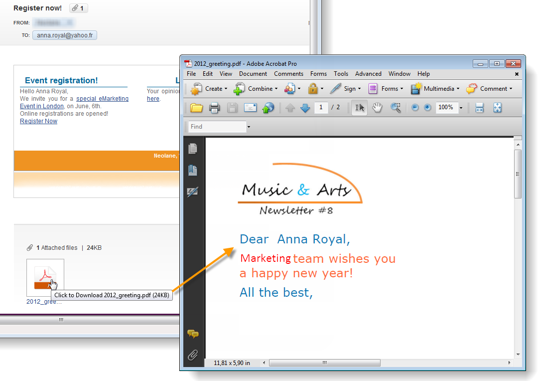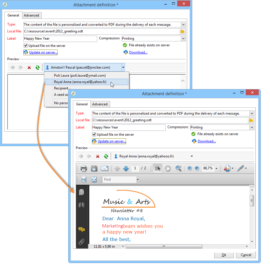옵션 The file content is personalized and converted into PDF format at the time of delivery for each message 수신자의 성 및 이름과 같이 개인화 필드가 있는 파일을 선택할 수 있습니다.