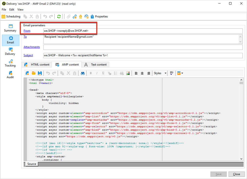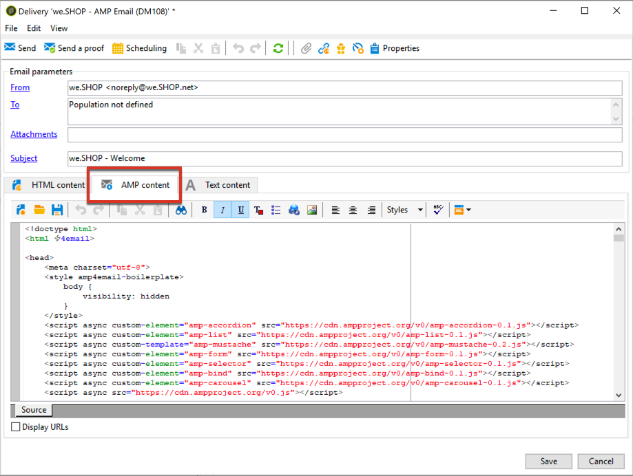 Adobe Campaign으로 돌아가서 유효성 검사된 컨텐츠를 에 복사하여 붙여넣습니다 AMP content 탭.