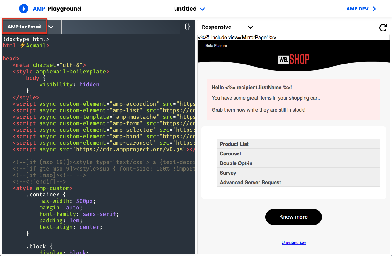 Adobe Campaign에서 직접 AMP 컨텐츠를 미리 볼 수 없습니다. 다음과 같은 외부 웹 사이트 사용 AMP 놀이터.