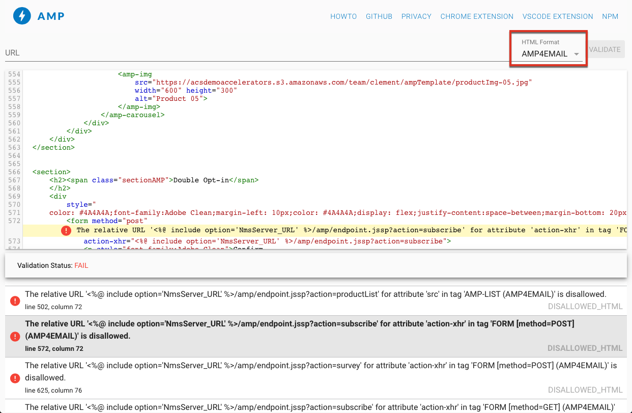 Adobe Campaign AMP 편집기는 콘텐츠 유효성 검사를 위해 설계되지 않았습니다. 와 같은 외부 웹 사이트 사용 AMP 웹 기반 유효성 검사기 컨텐츠가 올바른지 확인합니다.