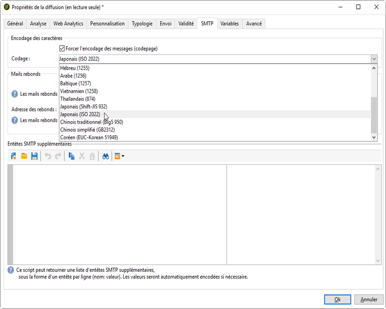 Dans l’onglet SMTP des paramètres de diffusion, la section Encodage des caractères vous permet de définir un encodage spécifique.