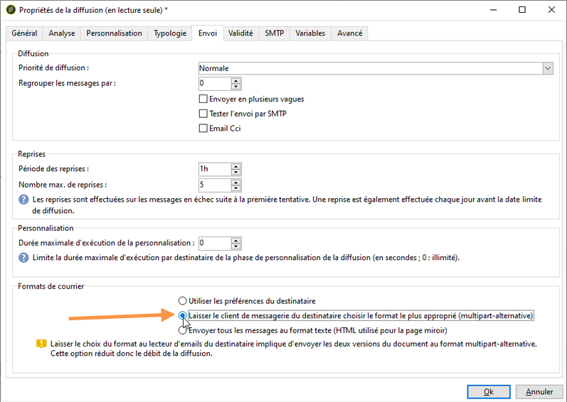 Vous pouvez paramétrer le format des emails envoyés. Pour cela, éditez les propriétés de la diffusion et cliquez sur l'onglet Envoi.