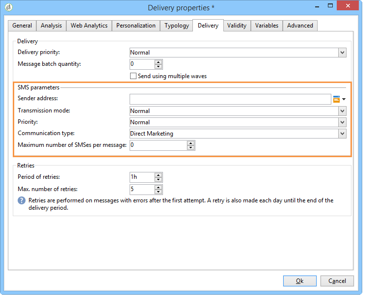 The Properties button gives access to the advanced delivery parameter. The parameters specific to SMS deliveries are in the SMS parameters section of the Delivery tab.