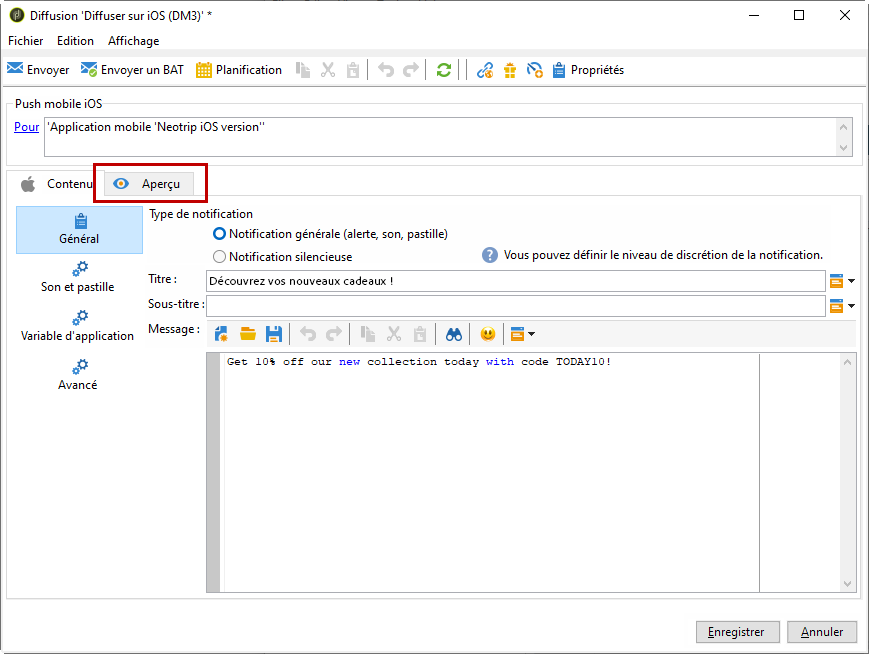 Un canal iOS permettant d’envoyer des notifications sur les appareils mobiles Apple.