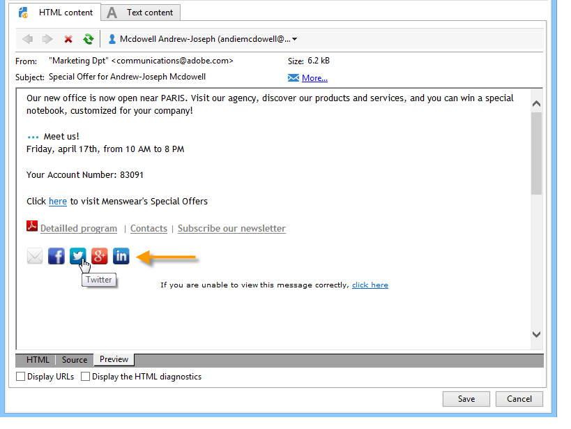 이 개인화 블록에는 모든 링크(모든 소셜 네트워크와의 메시지 전송 및 공유용)가 포함되어 있습니다. 필요에 맞게 변경할 수 있습니다. 그러나 구성은 고급 사용자를 위해 예약되어 있습니다. 일치하는 개인화 블록을 편집하려면 Resources > Campaign management > Personalization blocks 노드 아래에 나열된 상태로 남아 있습니다.