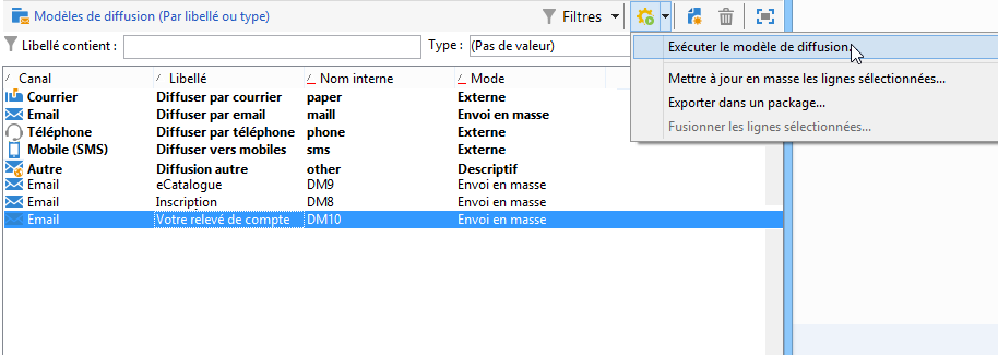 Vous pouvez lancer l'exécution d'un modèle directement depuis la liste des modèles, sans créer de diffusion au préalable. Pour cela, sélectionnez le modèle à exécuter et cliquez sur le bouton droit de la souris. Choisissez Actions>Exécuter le modèle de diffusion….