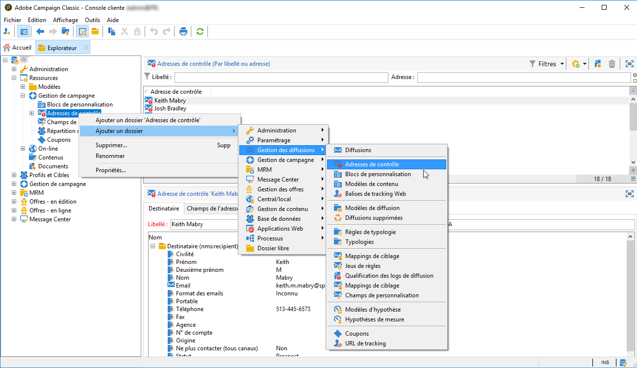 Les adresses de contrôle ne sont pas gérées via les profils et cibles standards, mais dans un nœud dédié de l'arborescence Adobe Campaign, sous Ressources > Gestion de campagne > Adresses de contrôle.