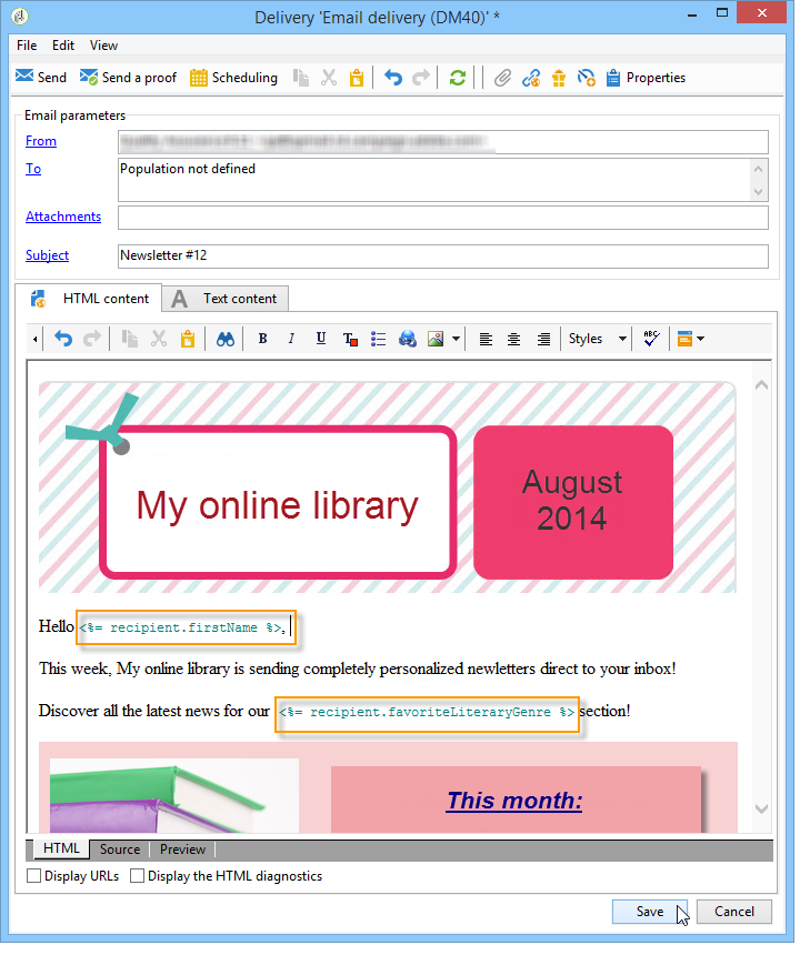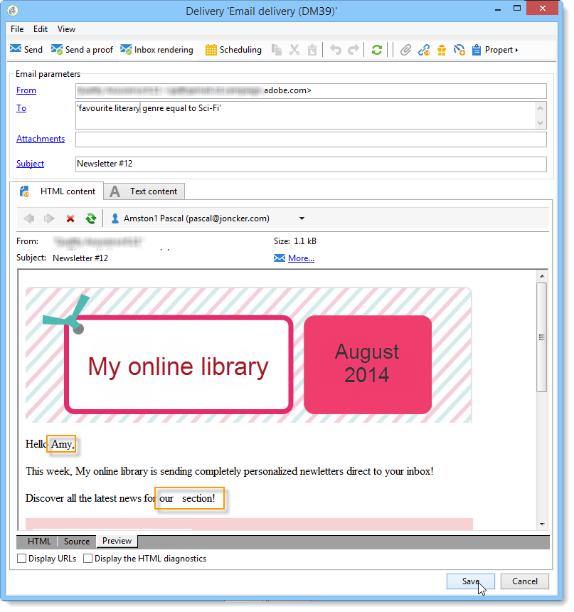 이 예에서는 게재에 두 개의 개인화 필드가 있습니다. 수신자의 이름 수신자의 인기 문학 장르.