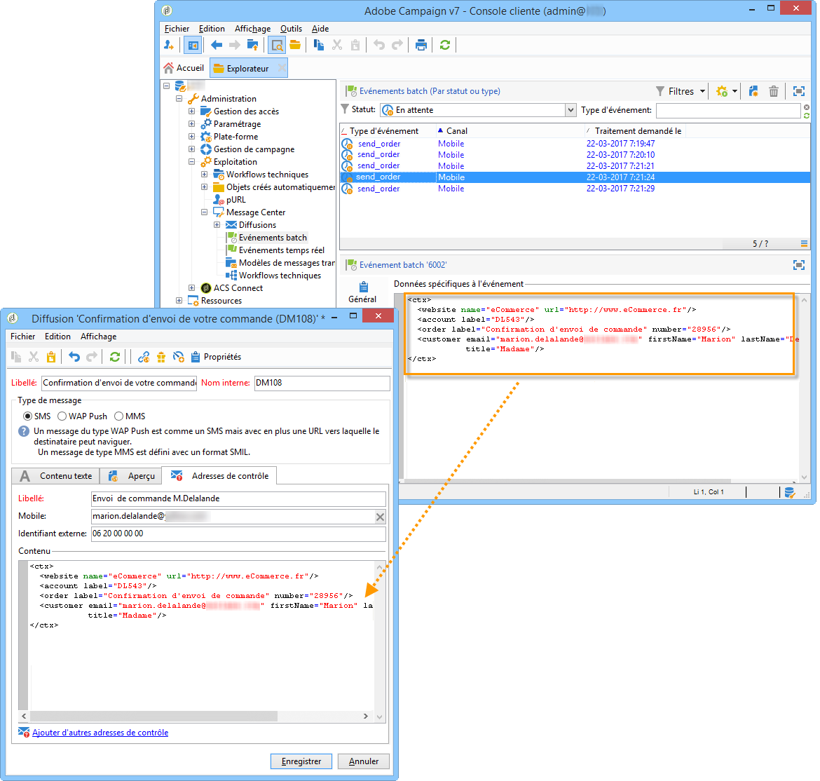 Ces données n'ont pour but que de tester vos messages avant leur diffusion effective et ne correspondent pas aux données réelles qui seront traitées. En revanche, la structure XML doit être identique à celle de l'événement qui est stocké dans l'instance d'exécution, comme illustré ci-dessous :