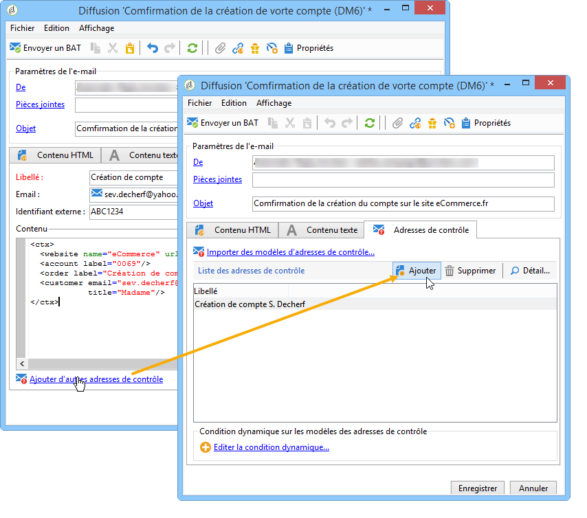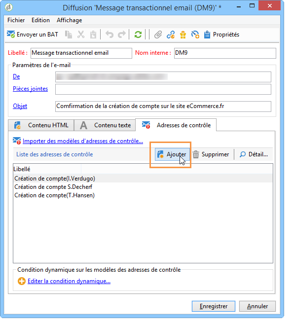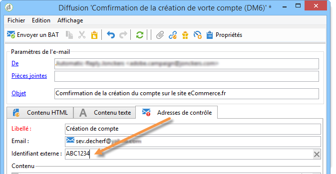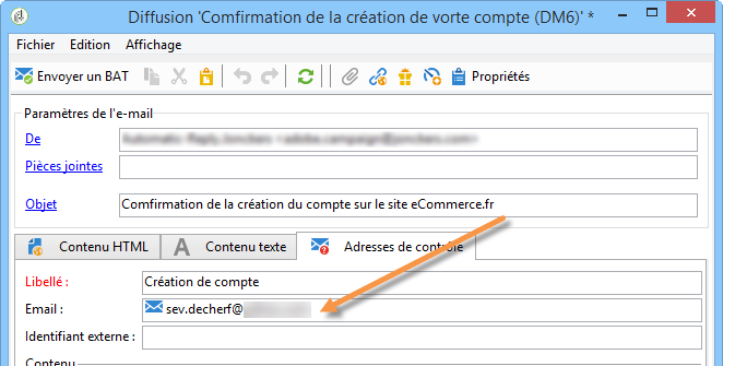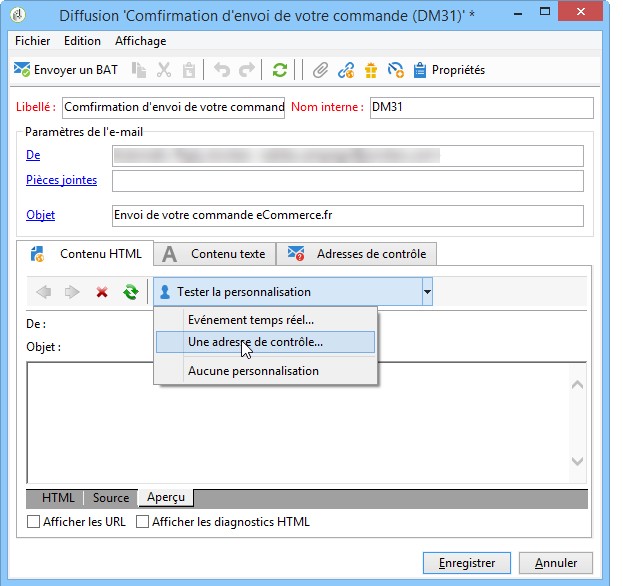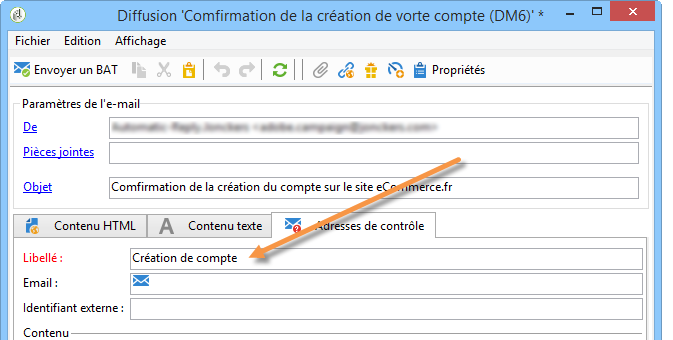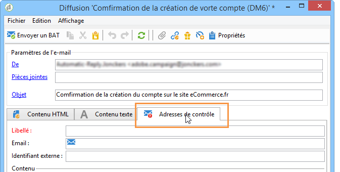 Une adresse de contrôle est utilisée pour afficher l'aperçu de votre message, envoyer un BAT et tester la personnalisation de votre message avant qu'il ne soit envoyé par email ou SMS. Les adresses de contrôle sont liées à la diffusion et ne peuvent être utilisées d'une diffusion à l'autre.