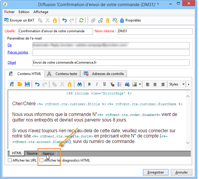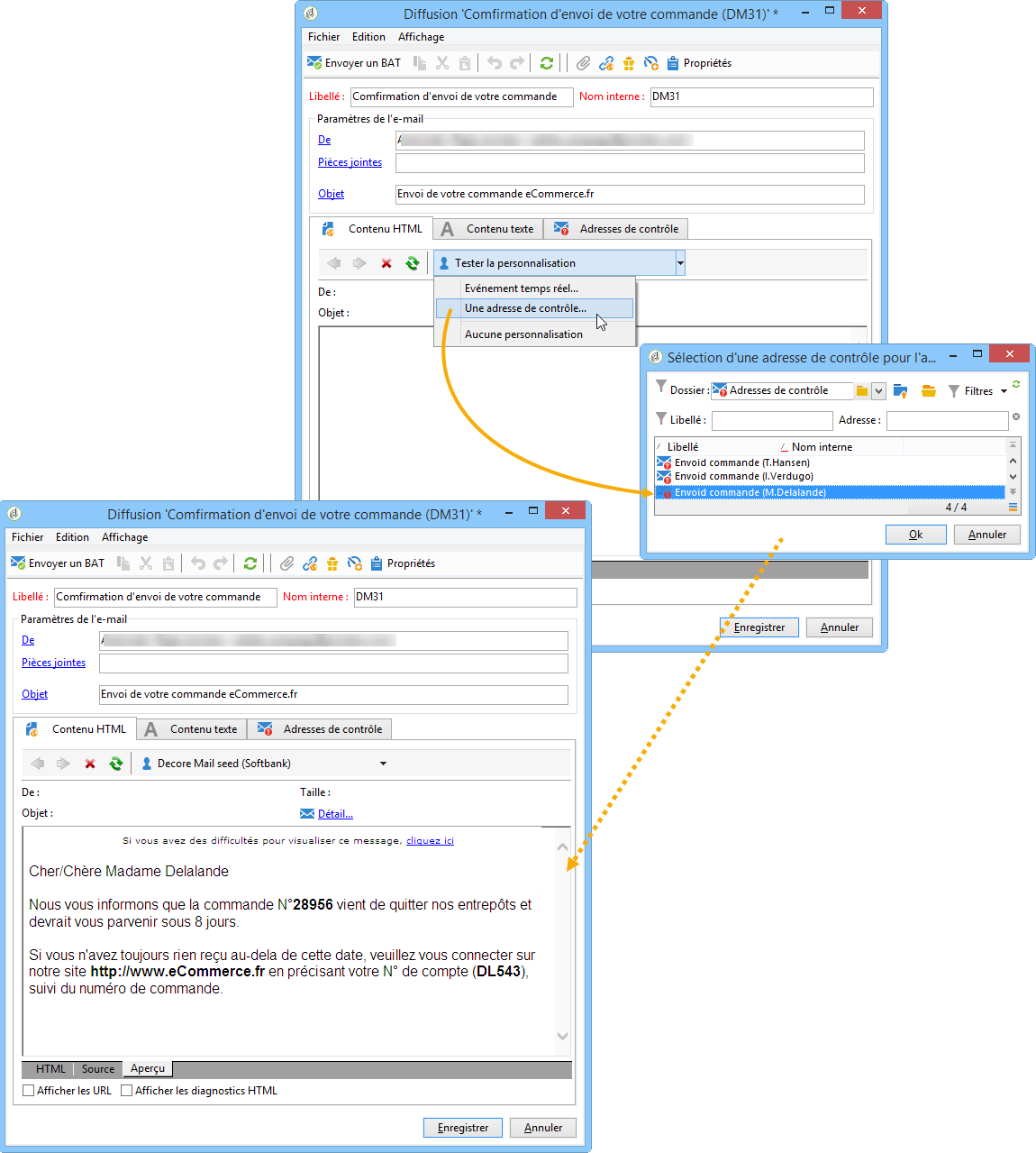 Lorsque vous avez créé une ou plusieurs adresses de contrôle, ainsi que le corps du message, vous pouvez afficher l'aperçu de votre message et vérifier la personnalisation de ce dernier.