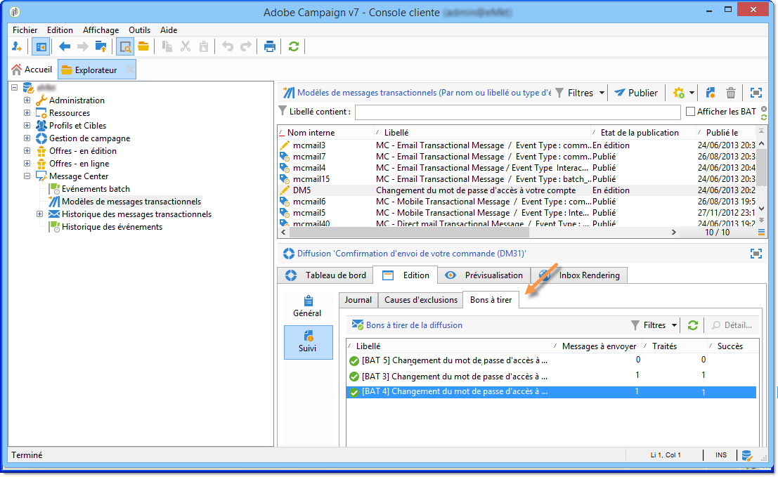 Les BAT sont accessibles au niveau de chaque modèle, depuis l'onglet Suivi. Pour plus d'informations à ce sujet, consultez Envoi d'un BAT.