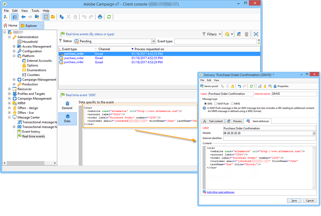 이 데이터의 목적은 최종 게재 전에 메시지를 테스트하는 것입니다. 이 메시지는 처리할 실제 데이터와 일치하지 않습니다. 그러나 XML 구조는 다음과 같이 실행 인스턴스에 저장된 이벤트의 구조와 동일해야 합니다.