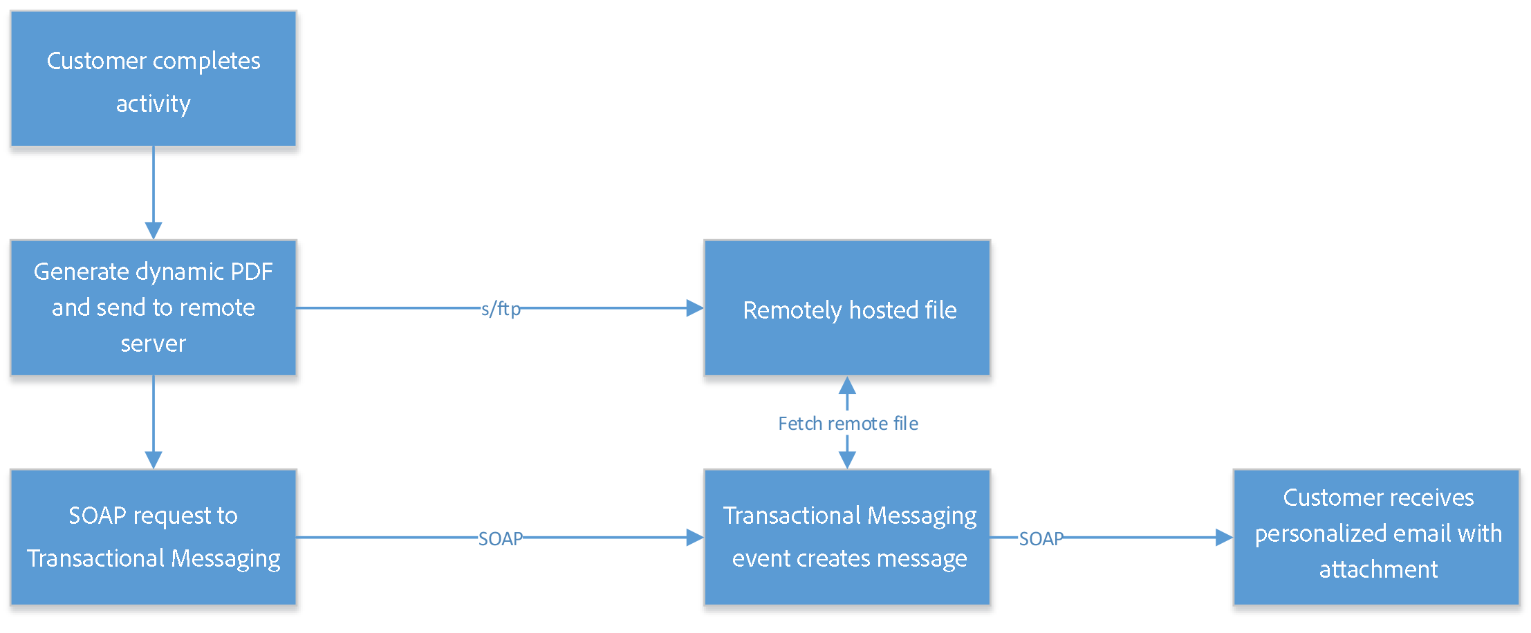 이 시나리오에서는 개별 및/또는 개인화된 첨부 파일이 있는 트랜잭션 이메일을 보내는 방법을 알아봅니다. 첨부 파일은 트랜잭션 메시지 서버에 미리 업로드되지 않습니다. 대신 즉시 생성됩니다.