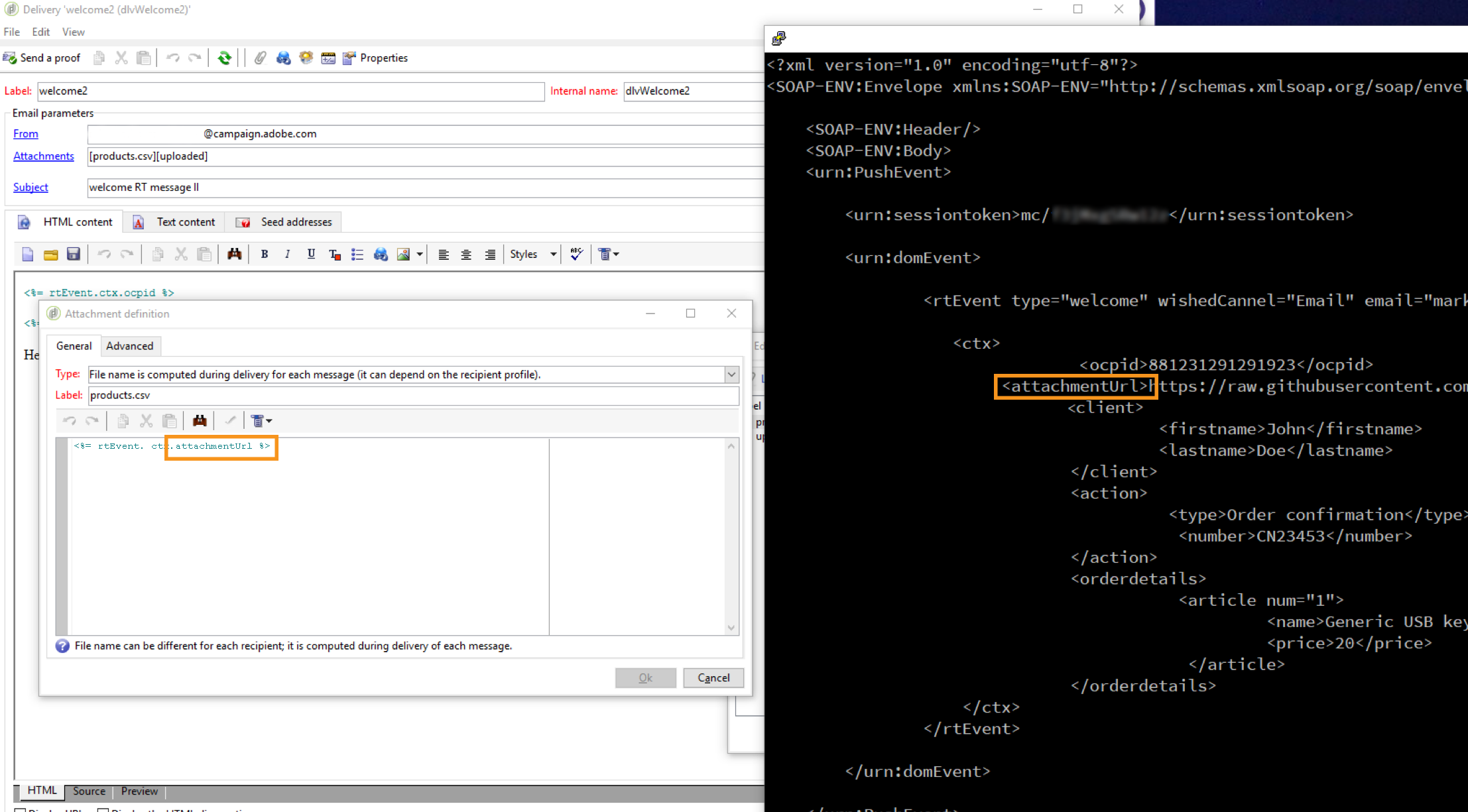 SOAP 메시지 트리거를 통해 이메일을 보낼 수 있습니다. SOAP 호출에는 URL 매개 변수(attachmentURL)가 있습니다.
