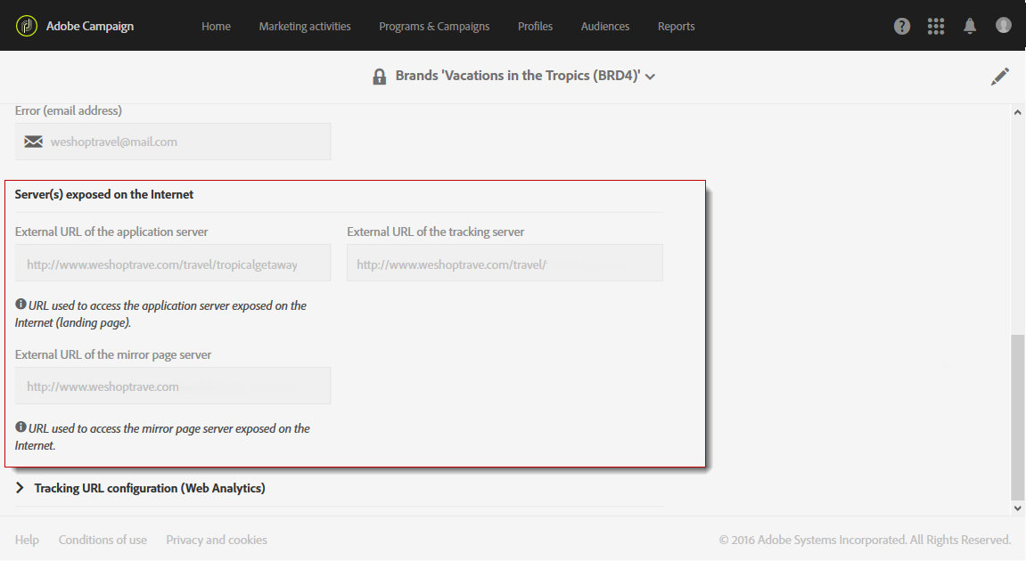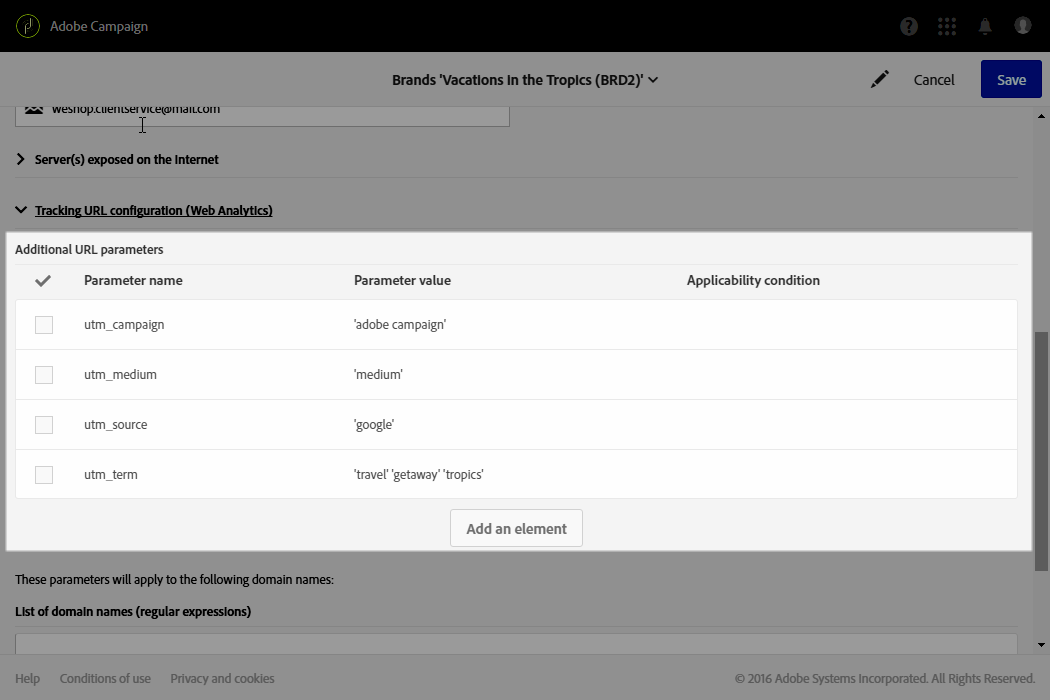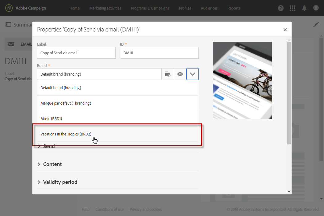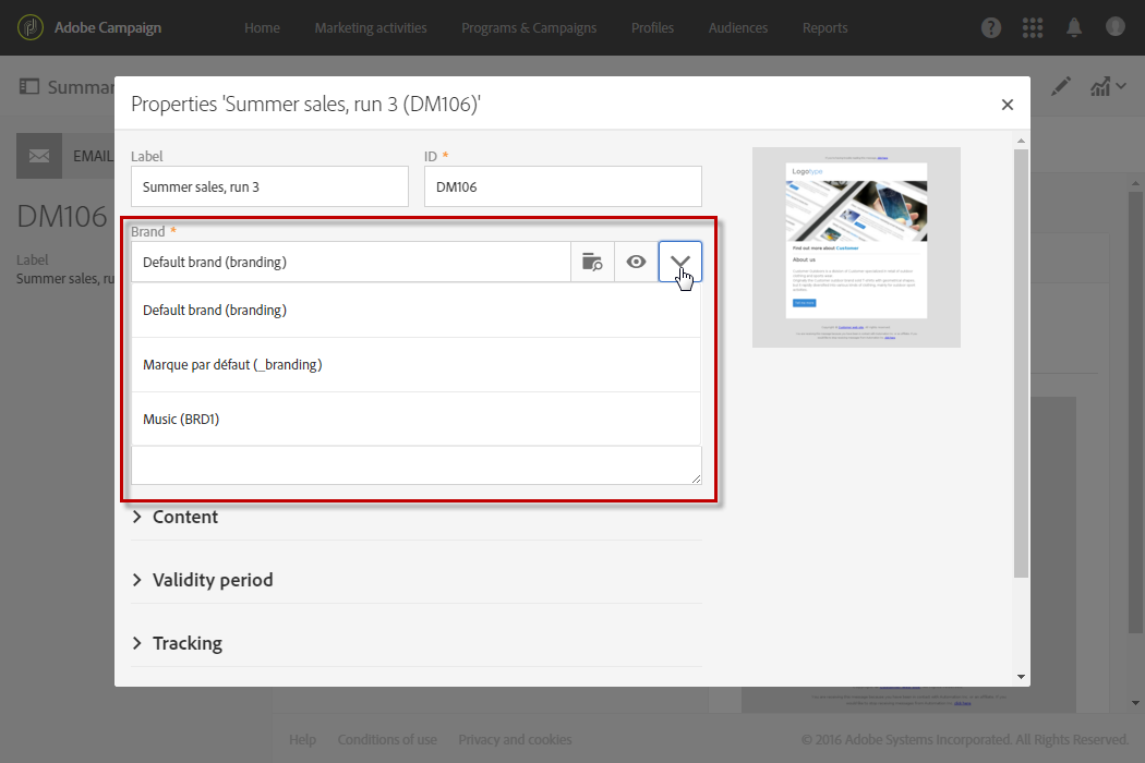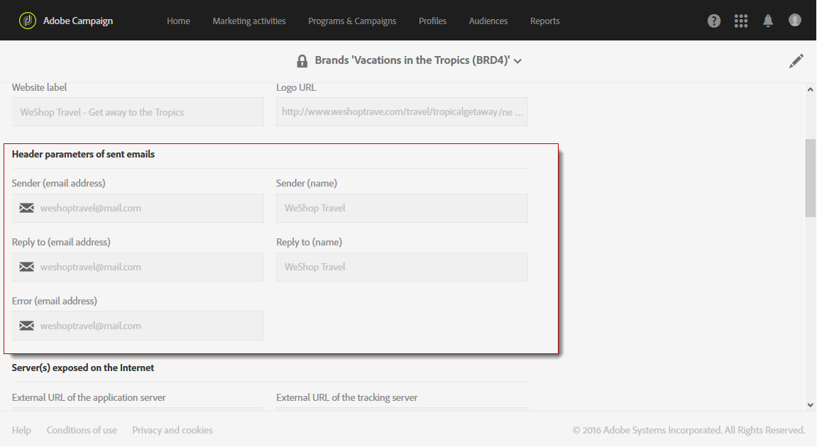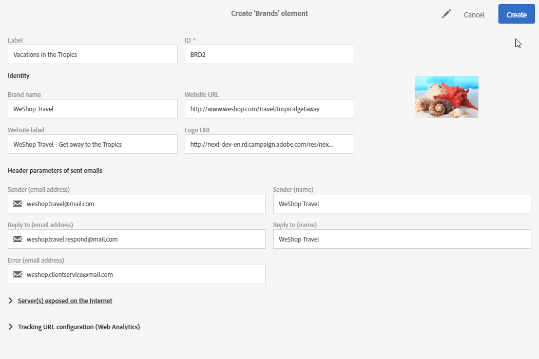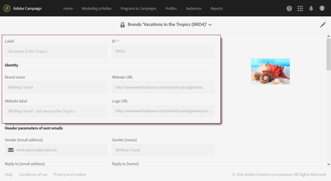 Adobe Campaign 관리자는 먼저 Administration > Instance settings > Brand configuration 메뉴를 추가하고 베케이션 인 더 트로픽 요소 및 구성 ID 그리고 Header parameters of sent emails 브랜드 자산입니다.